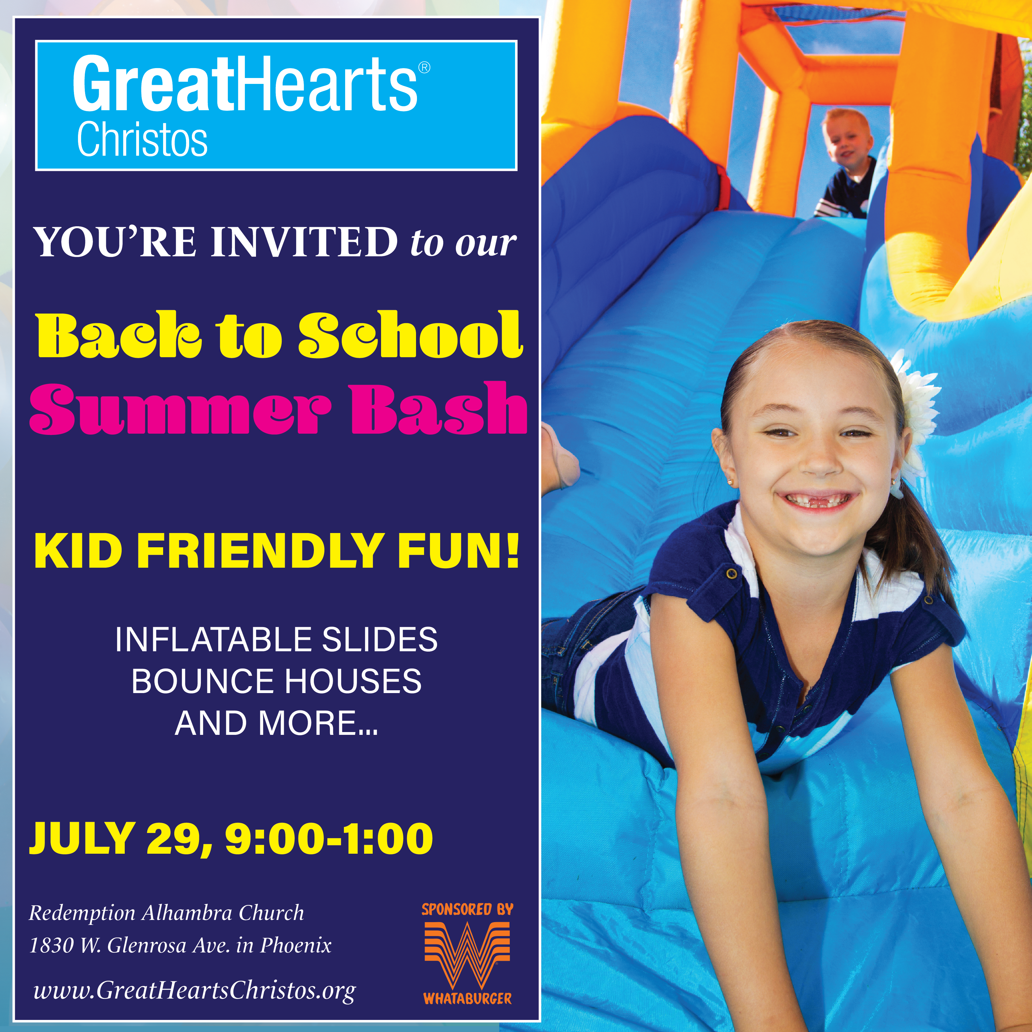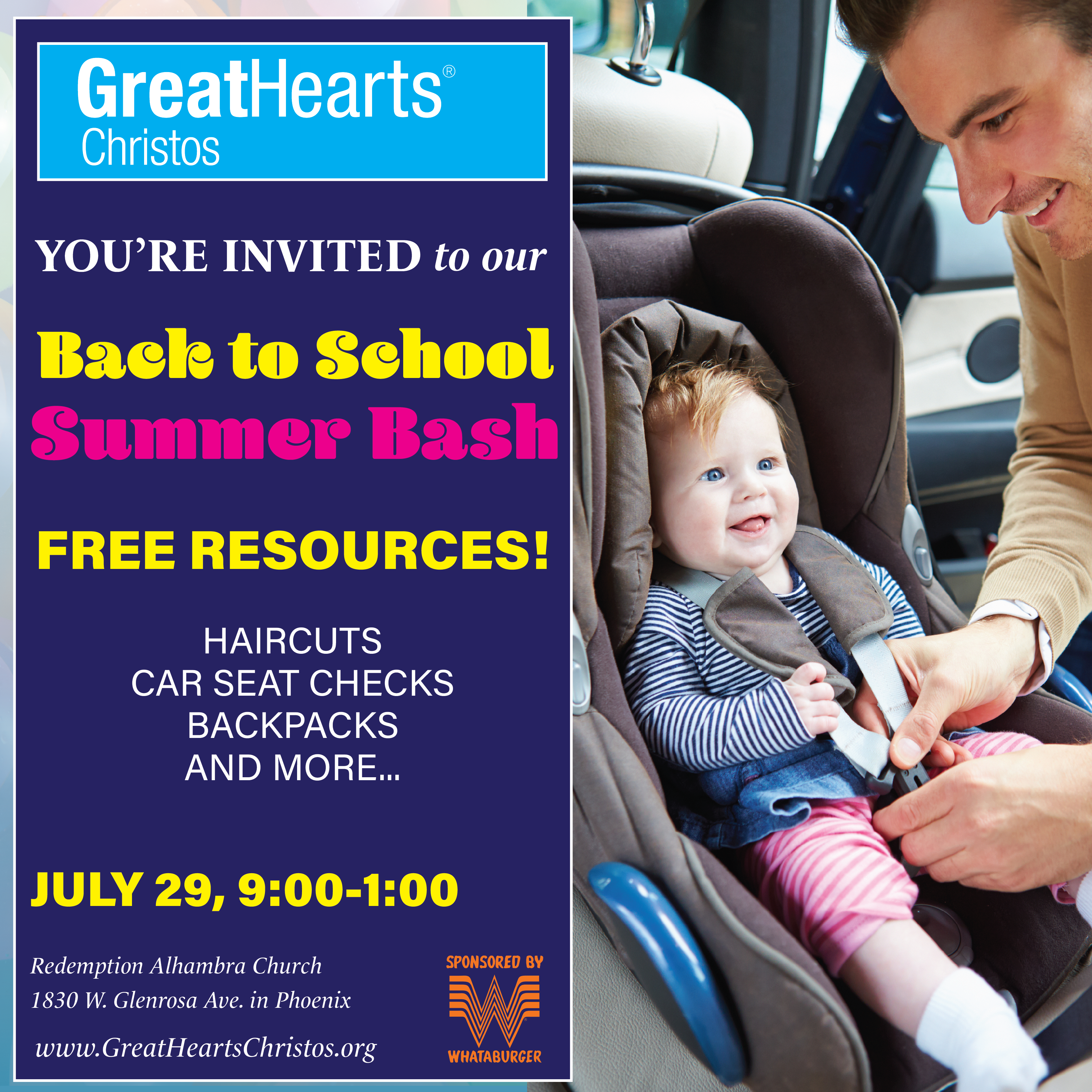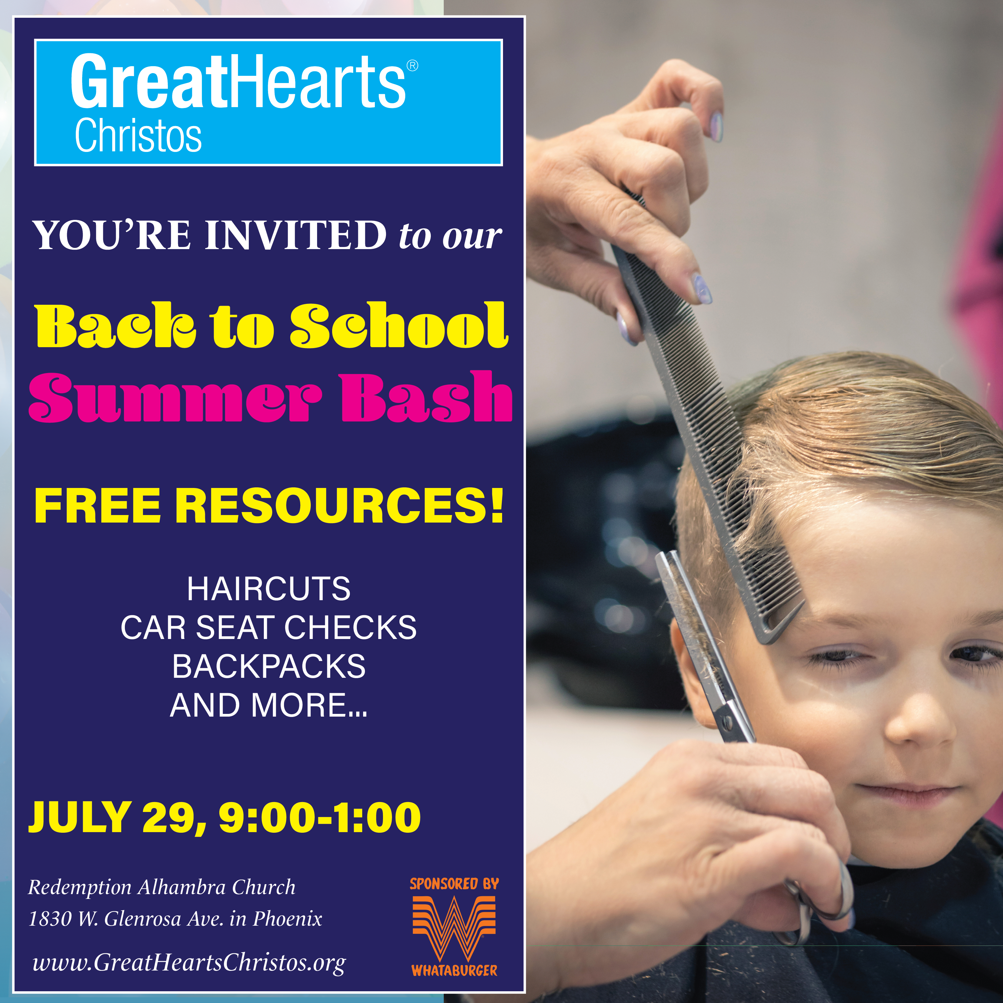 • Haircuts • Car seat checks provided by the Phoenix Fire Department • Water slides, bounce houses, and other carnival games — so bring your swimsuits! • Free food, games, and prizes provided by Whataburger that includes: hamburgers, sides, brownies, cookies, and drinks • Music • Face painting • Zoo animals • A cool place to hang out with your family!