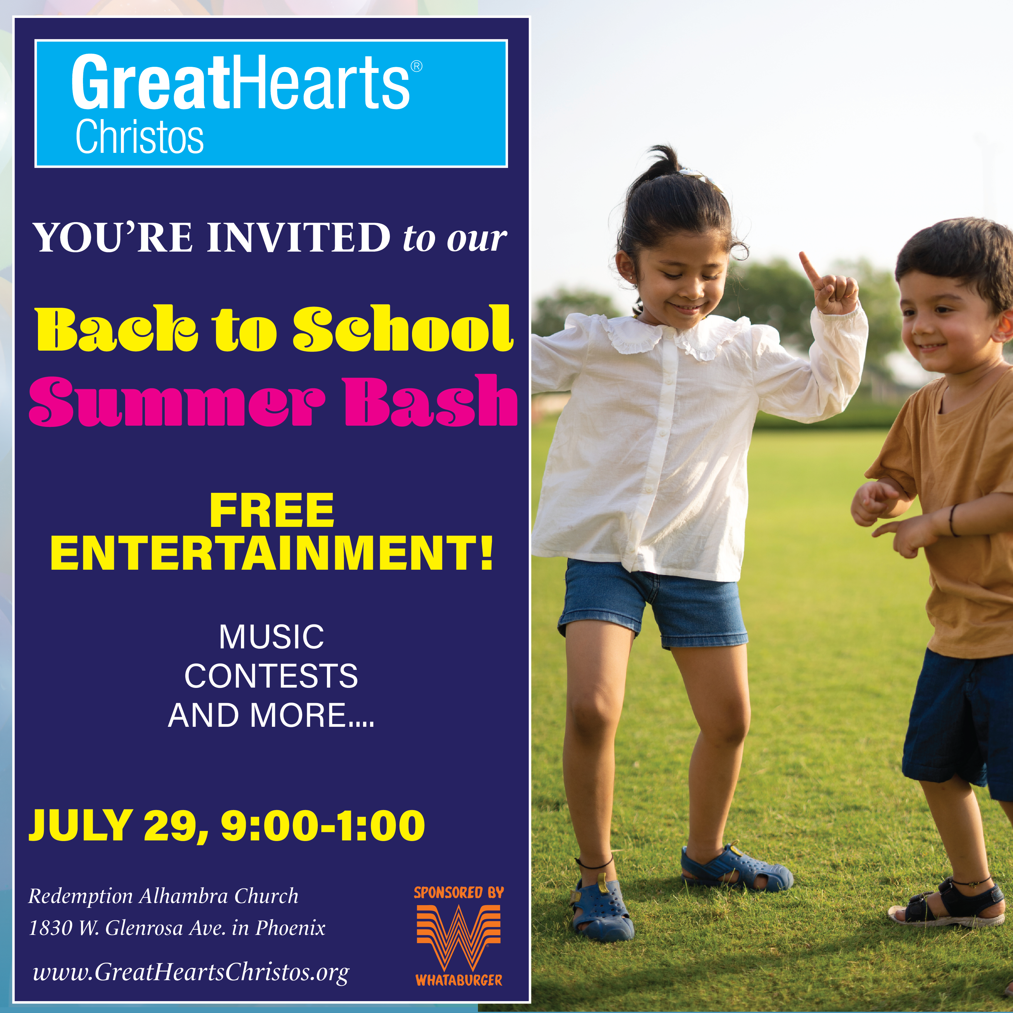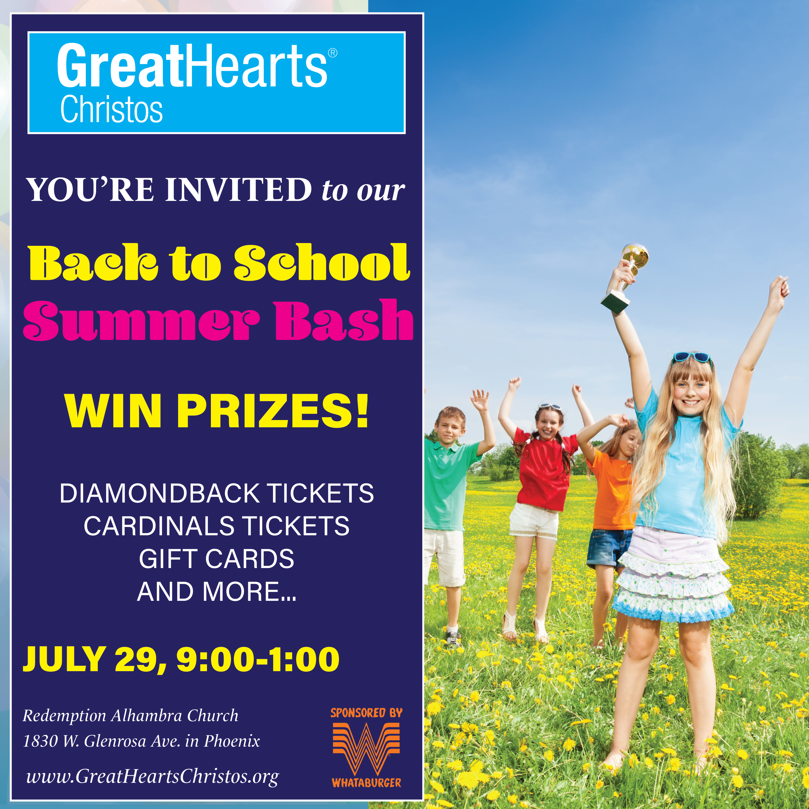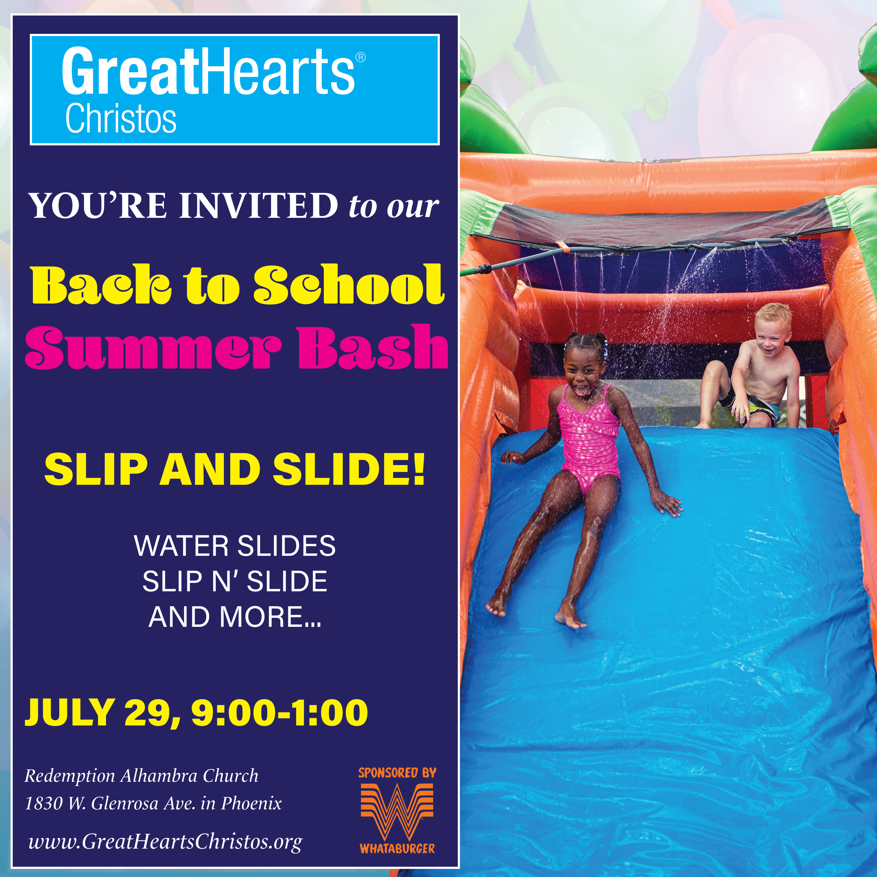 • Haircuts • Car seat checks provided by the Phoenix Fire Department • Water slides, bounce houses, and other carnival games — so bring your swimsuits! • Free food, games, and prizes provided by Whataburger that includes: hamburgers, sides, brownies, cookies, and drinks • Music • Face painting • Zoo animals • A cool place to hang out with your family!